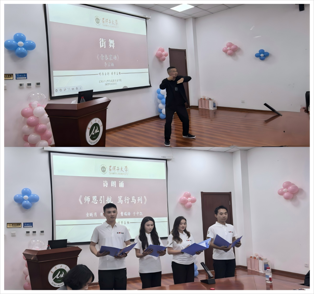 文艺表演与互动活动将现场气氛推向高潮。学生们带来原创诗朗诵《师恩引航,笃行马列》,表达了对教师的感恩之情与践行马列真理的坚定决心,真挚情感打动在场每一位观众。新进教师代表李宗赫献上街舞《青春震动》,灵活的舞姿、饱满的热情展现出新进教师的活力与朝气。