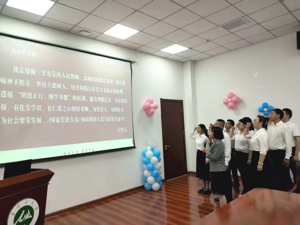新进教师是学院发展的新鲜血液,为强化其职业认同感与使命感,学院新进教师们身着正装、庄严肃立,高举右拳,进行庄严宣誓,以铿锵有力的誓言表达对教育事业的郑重承诺,投身教育教学事业的坚定决心。