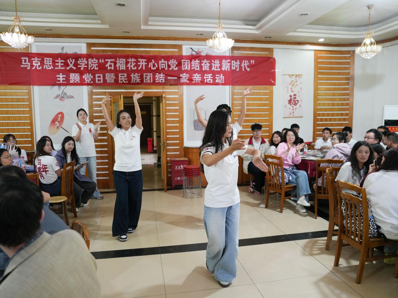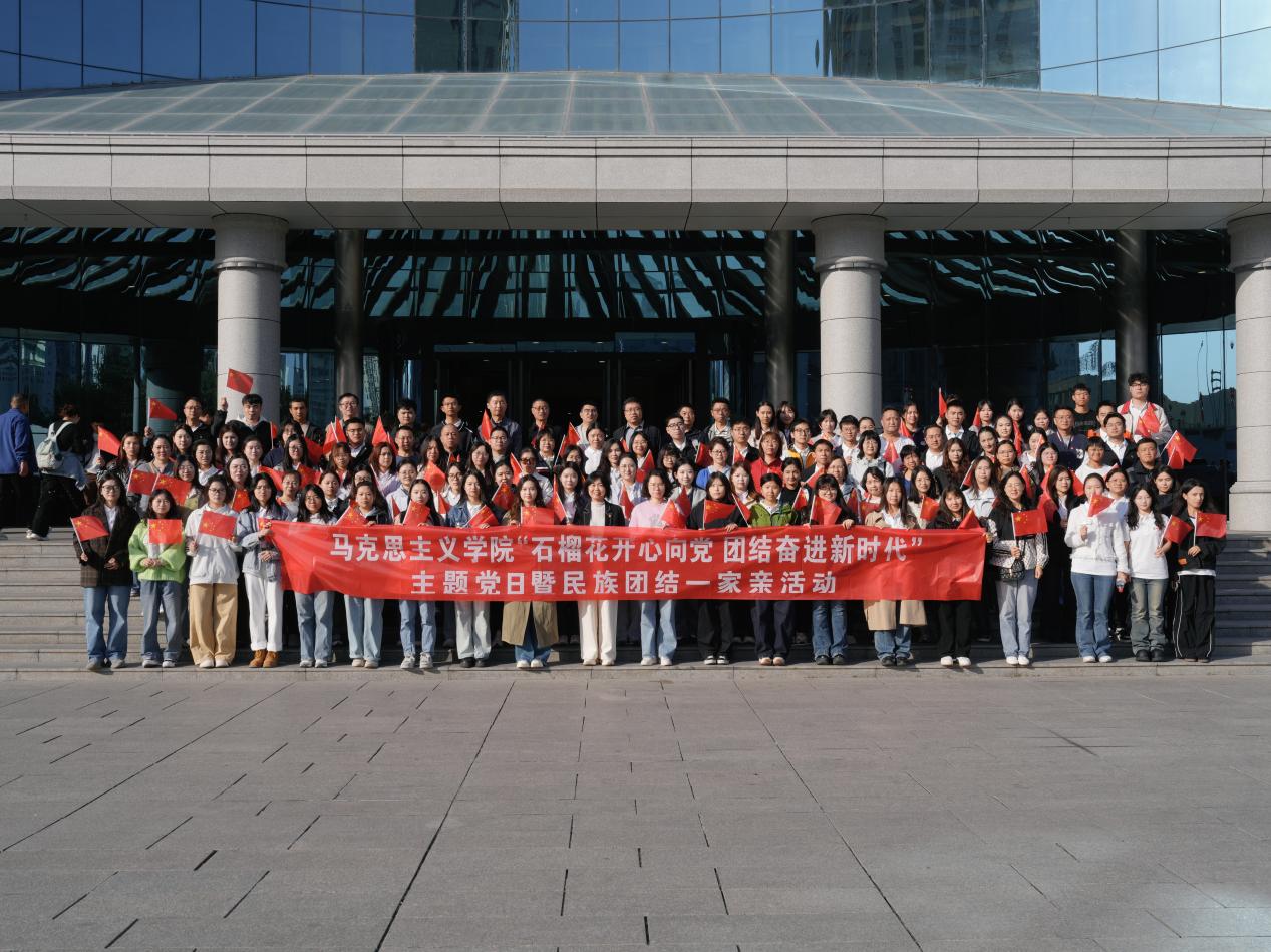为喜迎国庆中秋佳节,庆祝新疆维吾尔自治区成立 70 周年,9月28日,石河子大学马克思主义学院组织开展“石榴花开心向党 团结奋进新时代”主题党日暨民族团结一家亲活动。学院师生党员、结亲学生共计百余人通过参观研学、素质拓展、文艺展演、手工制作等形式,共叙民族团结情谊,共话新时代使命担当。