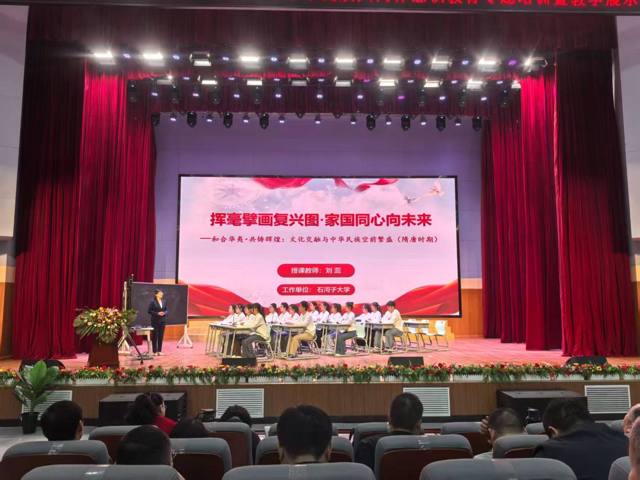 在现场课展示环节,6名来自石河子大学及其他师市的思政课教师紧紧围绕“铸牢中华民族共同体意识 共绘思政同心圆”主题,结合各自学段的教学特点和学情,先后进行了小学、初中、高中、中职、高职、本科教学展示课,以符合不同年龄阶段心理特征与教育目标的多元形式展示民族团结、国家认同教育等教学内容,并进行了专家点评。石河子大学马克思主义学院教师刘蕊以《挥毫擘画复兴图·家国同心向未来——和合华夷・共铸辉煌:文化交融与中华民族空前繁盛(隋唐时期)》作了教学展示,受到一致好评。