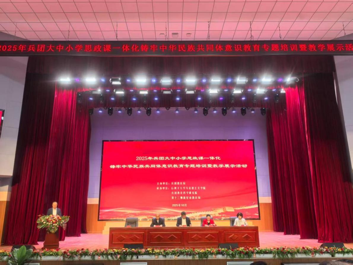10月14日至15日,由兵团教育局主办,石河子大学马克思主义学院、兵团教育科学研究院、第十三师新星市教育局承办的2025年兵团大中小学思政课一体化铸牢中华民族共同体意识教育专题培训暨教学展示活动在十三师新星市成功举办。此次活动旨在深入学习贯彻习近平新时代中国特色社会主义思想,深入贯彻落实习近平总书记关于加强和改进民族工作的重要思想,铸牢兵团中华民族共同体意识教育大中小学一体化思政课建设。第十三师新星市党委常委、副师长王永峰,兵团教育局思政处处长金亚丽,兵团教育科学研究院院长李新东,第十三师新星市教育局党组书记、局长马兴,石河子大学马克思主义学院党委书记桑华与学院部分师生代表,兵团各师市大中小学不同学段教师代表参与本次活动。此次活动同时开设了直播模式,兵团各师广大师生线上观摩优质课程。