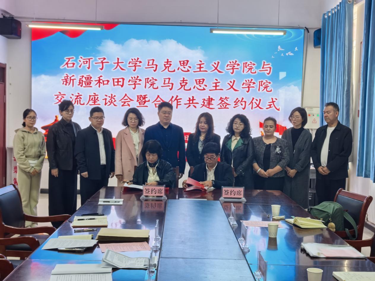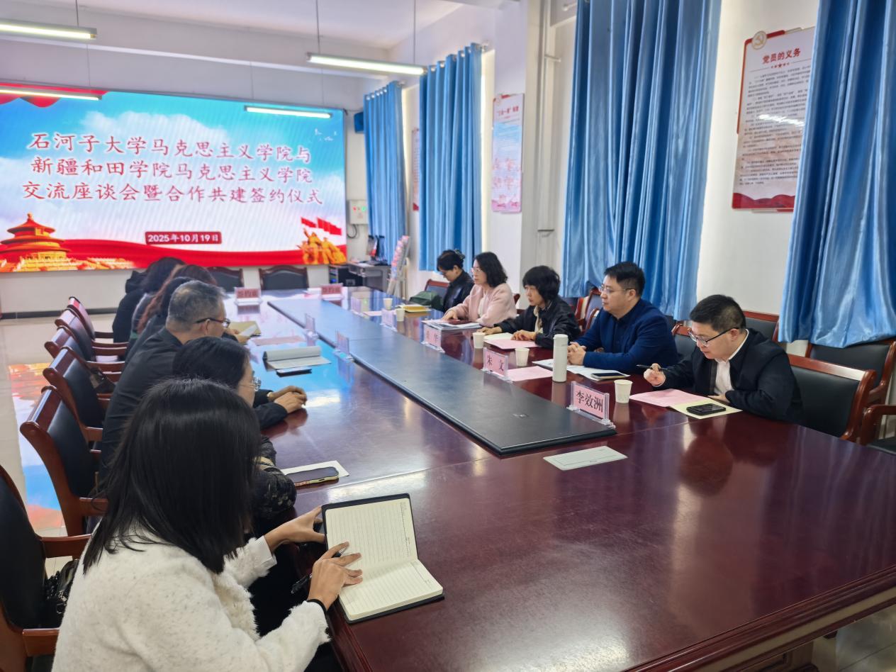为深入学习贯彻习近平新时代中国特色社会主义思想,贯彻落实习近平总书记关于铸牢中华民族共同体意识的重要论述,不断加强和改进新时代思想政治教育,10月19日,石河子大学马克思主义学院与新疆和田学院马克思主义学院交流座谈会暨铸牢中华民族共同体意识教育实践基地合作共建签约仪式在新疆和田学院涵德楼二楼会议室举行,两院领导、教师代表30余人齐聚一堂,共话发展,共谋新篇。会议由新疆和田学院马克思主义学院党总支副书记库尔班尼萨·努尔麦麦提主持。