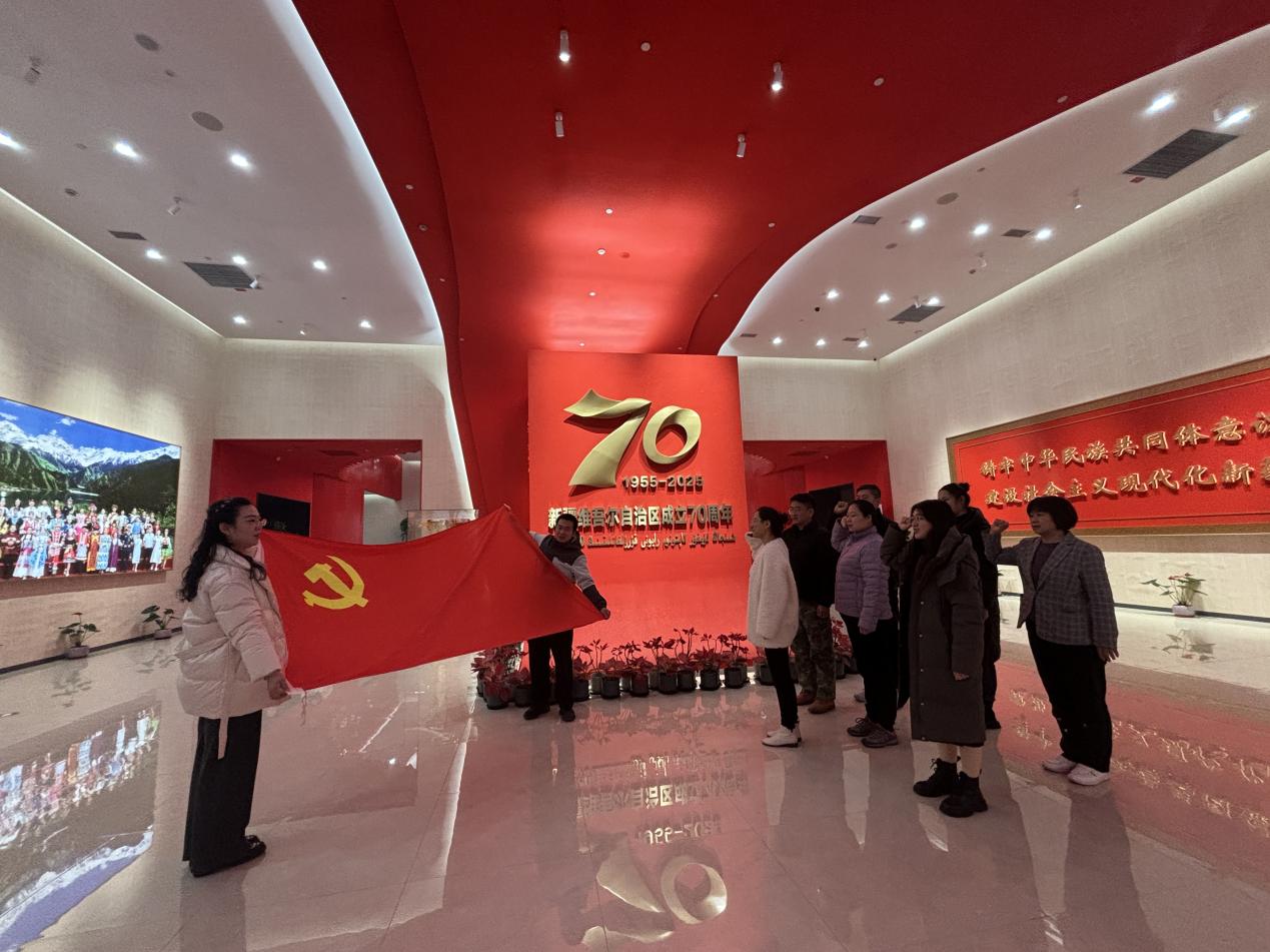面对鲜红的党旗,全体党员重温入党誓词,表达牢记初心使命、践行立德树人的坚定信念。在参观“新疆维吾尔自治区成立70周年成就展”时,大家感慨万分。从一穷二白到经济繁荣,从封闭落后到开放进步,从温饱不足到人民生活蒸蒸日上,一组组对比鲜明的数据、一件件见证历史的实物、一个个感人至深的故事,生动记录了七十载波澜壮阔的奋斗历程,鲜活展现了各族儿女团结一心、守望相助、共同建设美好家园的壮丽画卷。参观期间,大家同前来参观成就展的昌吉第二中学的部分学生开展交流分享。