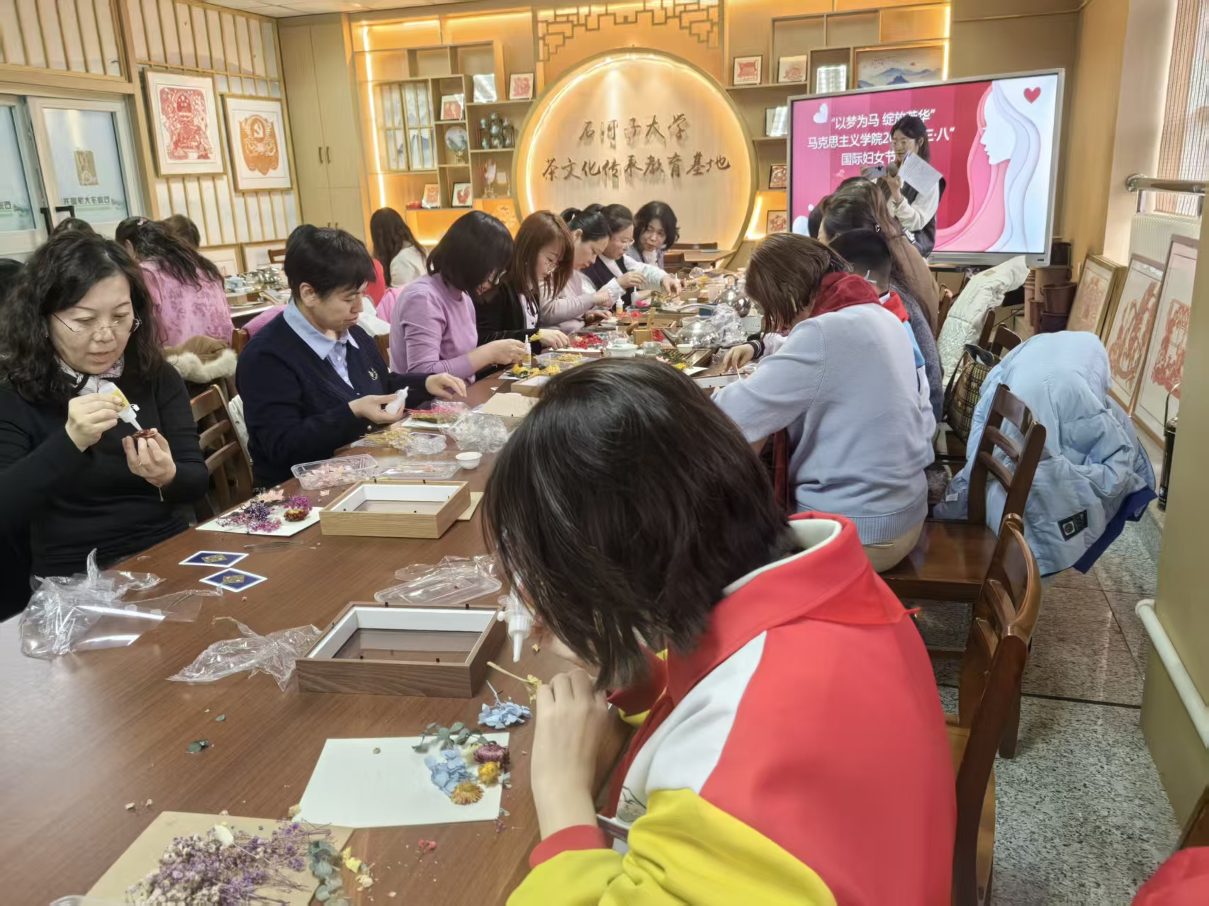 干花手工设计制作成为活动的一大亮点。在分组比赛中,女教职工发挥创意,制作独具匠心的干花花艺作品。一件件充满巧思的手工作品逐渐成型,不仅展现了女教职工的动手能力与艺术审美,更让大家在忙碌的工作之余感受到了创作的乐趣与成就感。