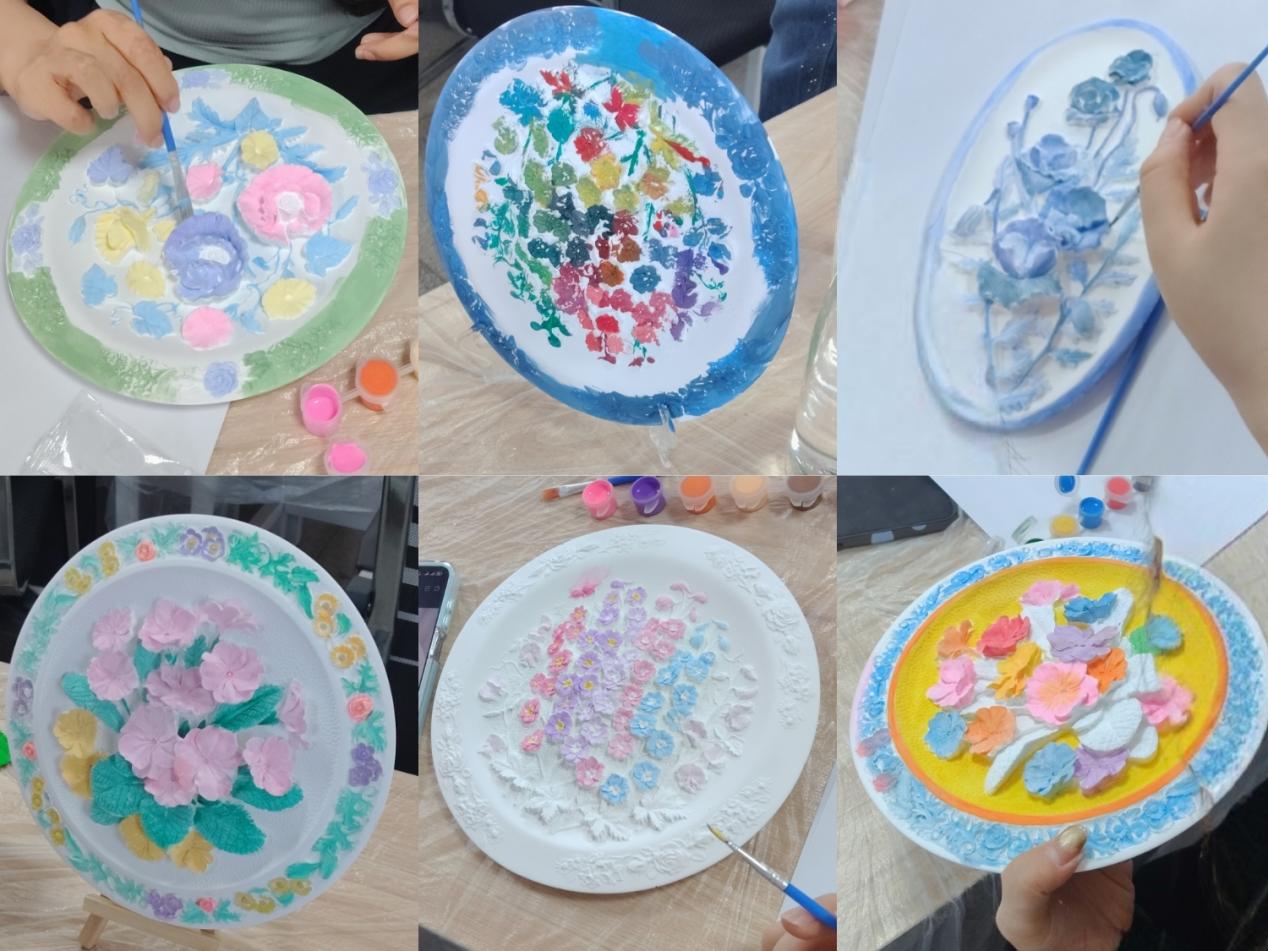 在轻柔的背景音乐中,师生们围绕石磨花素坯执笔调色,投入创作。有的参照精美示例精心绘制,有的则自由发挥,寄托个人心绪。笔触流转之间,一件件融合了情感表达与多元文化元素的作品渐次呈现。专注的创作过程本身,为参与者提供了一次安放情绪、表达自我的疗愈体验。